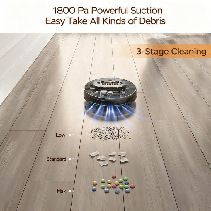 Max 1800Pa Super Strong Suction: Intelligently identifies and adjusts suction power based on different floor types. The powerful 1800Pa suction effectively cleans debris, pet hair, and food scraps from hard floors and low-pile carpets, delivering effortless cleaning.